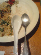そのシャシャ音皿と銀色のスプーンという私の中では最悪な組み合わせが出てきて、いつもは、無理したら耐えられるんだけど、今日のは三口目くらいで、もう「もわぁ~うぅ~う~~×○?*!ぐぅ~」みたいなくすぐったい気分になり本当に耐えられなくなって、お店の人に、プラスチックのレンゲと交換して頂きました(笑)